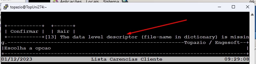If you do have the source code; then one way is to search for the display string 'Sair' as one hopes it occurs near to the line trying to manipulate the file and insert a 'DEBUG' statement, and compile. This will cause the execution to drop to debug; at which point you can use the normal debug commands to set an execution window of a few lines and 'step' through the program until the error occurs at which point view the code.