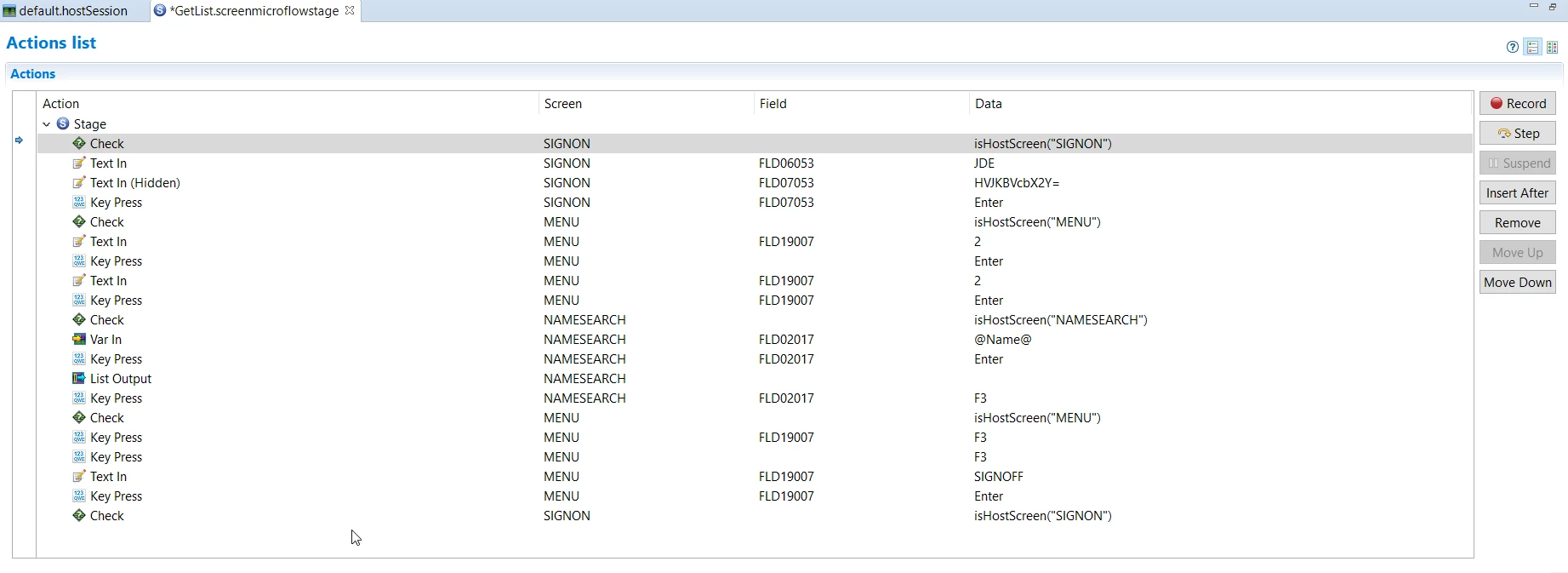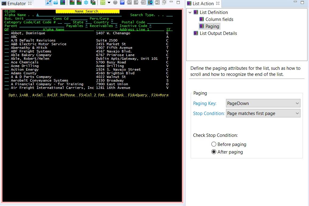 We need to know how the application pages. So select the paging key as page down (unless you use a different key) and you need to select a stop condition. If you are using More and Bottom for your list then select the field on the screen that will contain more and Bottom and Enter the field contents to contain the word "Bottom" when at the bottom of the list . In my case when I page, the list goes back to the first page when reaching the bottom so I select Page Matches first Page. Press Next: