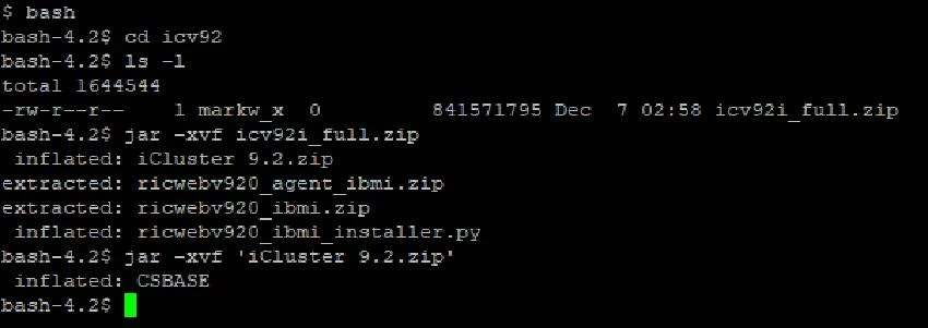 I then go to my ssh session and extract the files from the zip. My example will use 'putty' for ssh. The command I'm using is 'jar -xvf file.zip' to extract the members from the zip file I created. (You can confirm in advance you have java installed or another command to unzip the zip files. Otherwise it may be necessary in your case to unzip the files on your desktop prior to transferring them to your IBMi host.) Then I'll extract the CSBASE savf from the 'iCluster 9.2.zip'.
