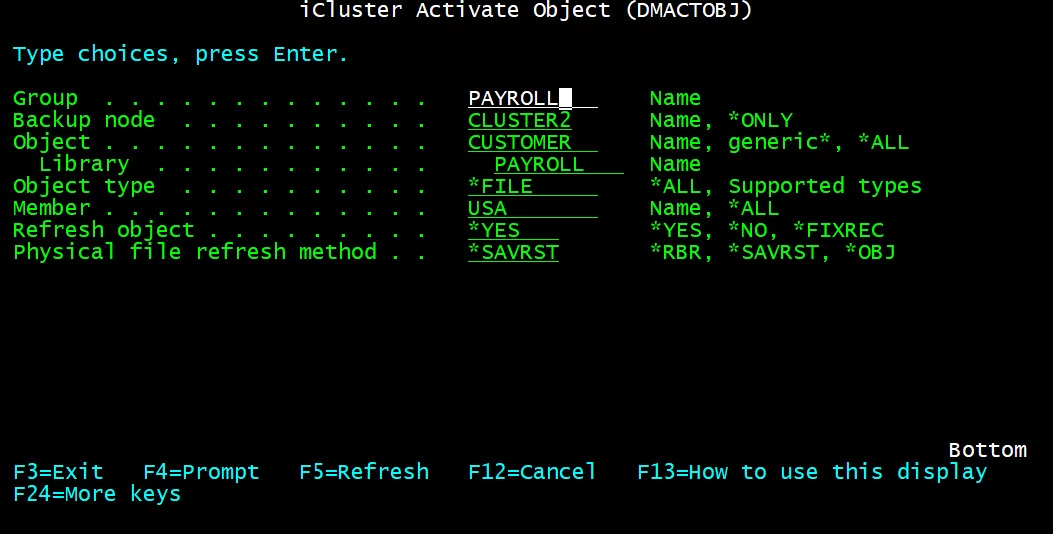 In our example, we are going to refresh (RFSH=*YES) the USA member in CUSTOMER/PAYROLL file and choose to refresh by a save/restore (PFRFSHMTD=*SAVRST).