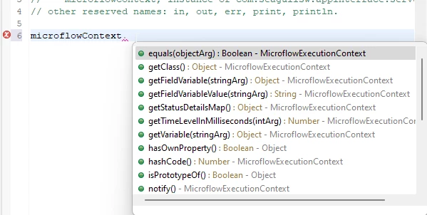 If you want to check upon more javascript functions from the hostSession and or microflowContect, press after the . (dot) Ctrl+Spacebar:
