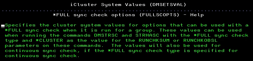 But if actually FULLSCOPTS *YES works for both manual and continuous SC, then I ask that iCLuster developer team set FULLSCOPTS to *YES as a default value at least for the Check File Content part. This is because setting it to *NO by default causes a hassle of running DMSTRSC twice to ensure a really full OOS report and replication.