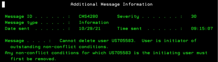 CMS4280 Cannot delete user XXXXXXXXXX. User is initiator of outstanding non-conflict conditions.A non-conflict condition is a warning of an outstanding event. Example a DATASET which failed to be updated (locked file)