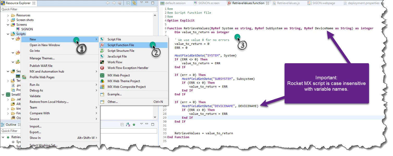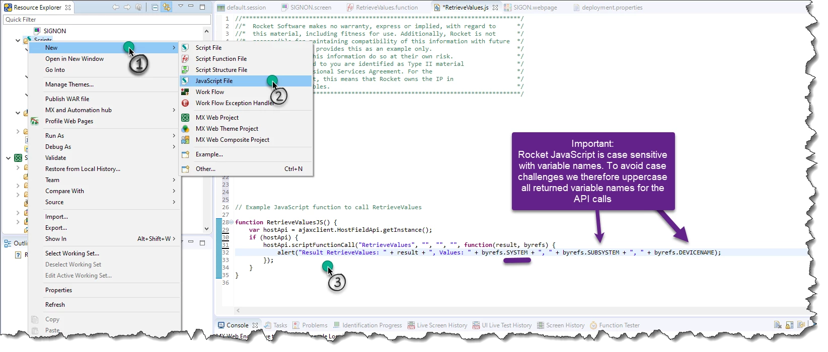 Also note that the names of returning values are uppercased, because JavaScript is case sensitive but Rocket MX script is not. To avoid challenges the variable names will always be uppercased.