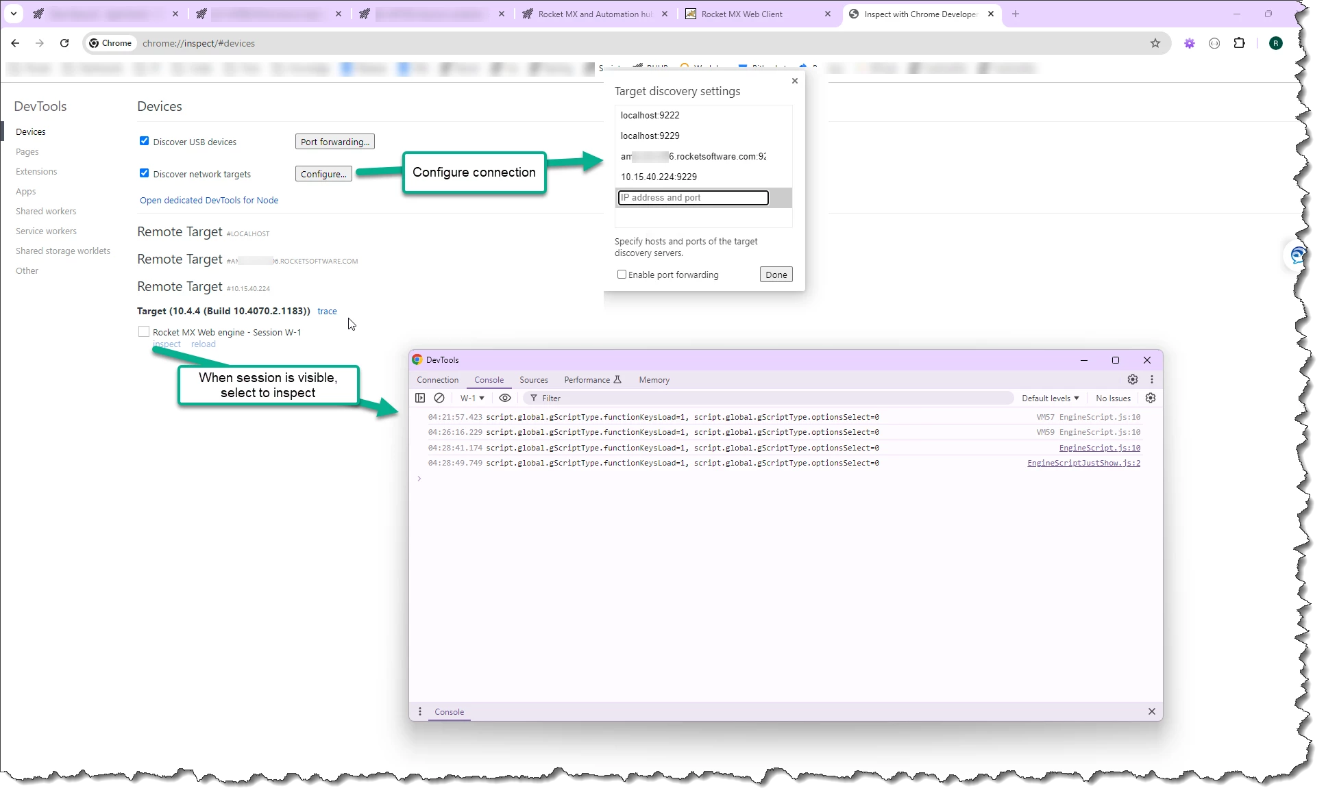 After restarting the engine with these settings, you can add the engine address in your chrome://inspect connection configuration.