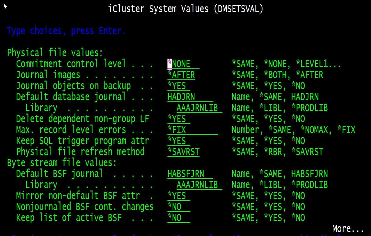 You can also change the system default for default database journal and default BSF journal so that even if some group gets created without the override for default, journal usage is pointed away from the iCluster library. Again, your config is not wrong however your future maintenance will be eased with this adjustment. As soon as the default value is successfully changed, any future encounter for an object to be journaled by iCluster will be directed to the specified default. This capture is from page 4 of the DMSETSVAL command.