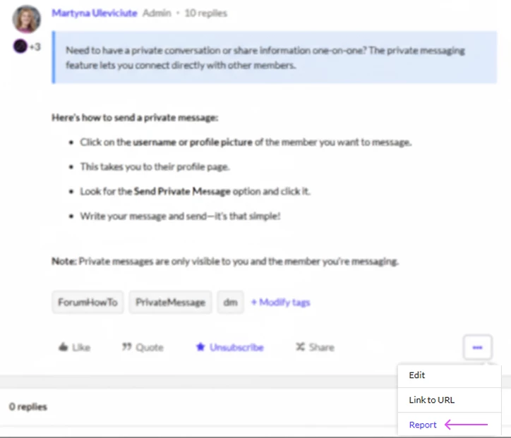 If you do not see a report option, or if you prefer, you can always send a private message to