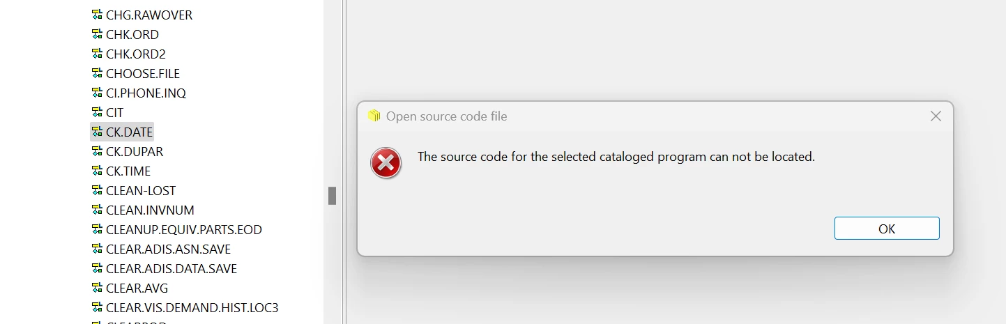 Since the program launches, I decide to try something simple like opening a program but get this error. The source code does exist in file of the shown in the VOC of CK.DATE.