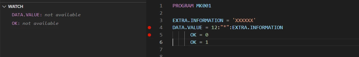 Now I would like to see the correct values in the WATCH debugger but each one has "not available" (OK = 1 )