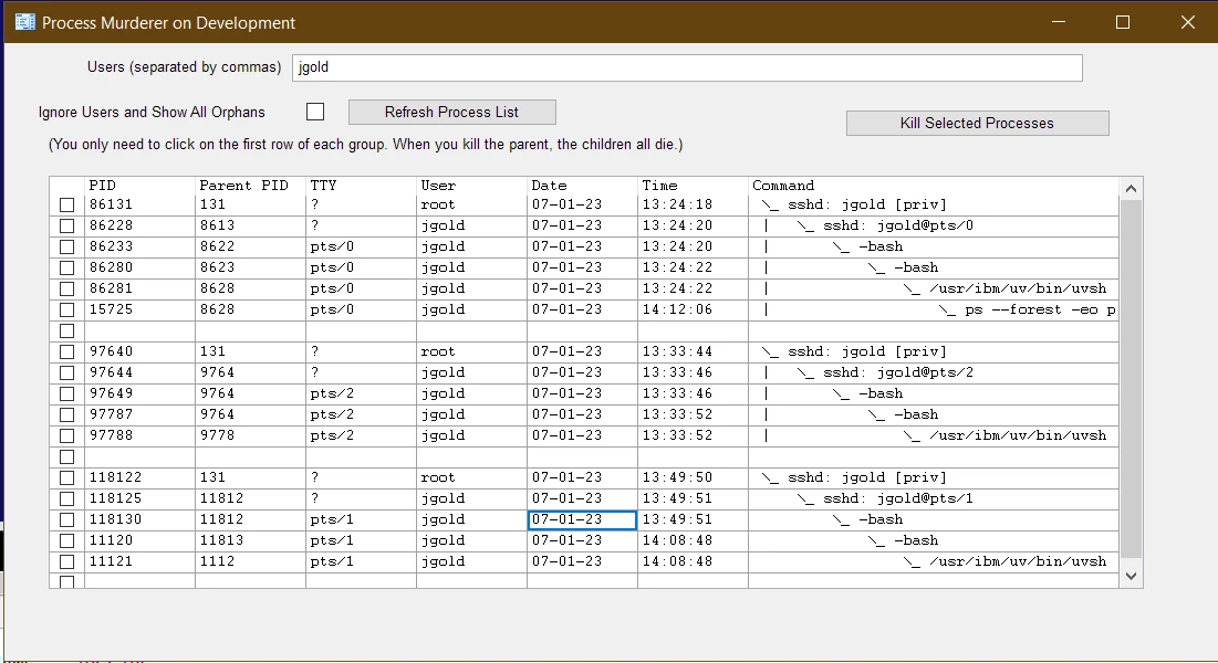 This is only showing my processes. If the process tree is orphaned it gets highlighted. Anyone using it has to be able to use sudo. Let me know if you want to try it and I'll post a zip file with all the dependencies.