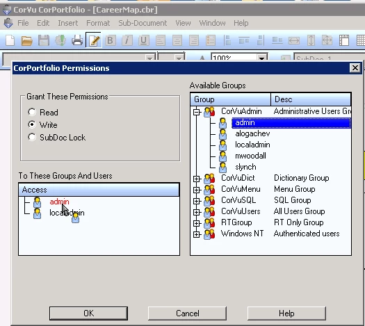 The screengrab below shows the CorPortfolio Permissions panel for a file called CareerMap.cbr (each file can have different settings).