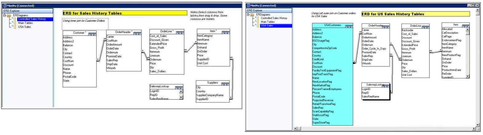 Below you can see how in the ERD for US Sales History the SalesrepLookup table is linked to the OrderHeader table, but in the other it is not. This would not be possible if both ERDs are made on the same KL database. (BTW I also used the Hide/Show columns feature in the ERD to conceal certain columns from users e.g. the columnĀ Order_Cycle_In_Days is only visible for selection in the ERD for USA Sales)