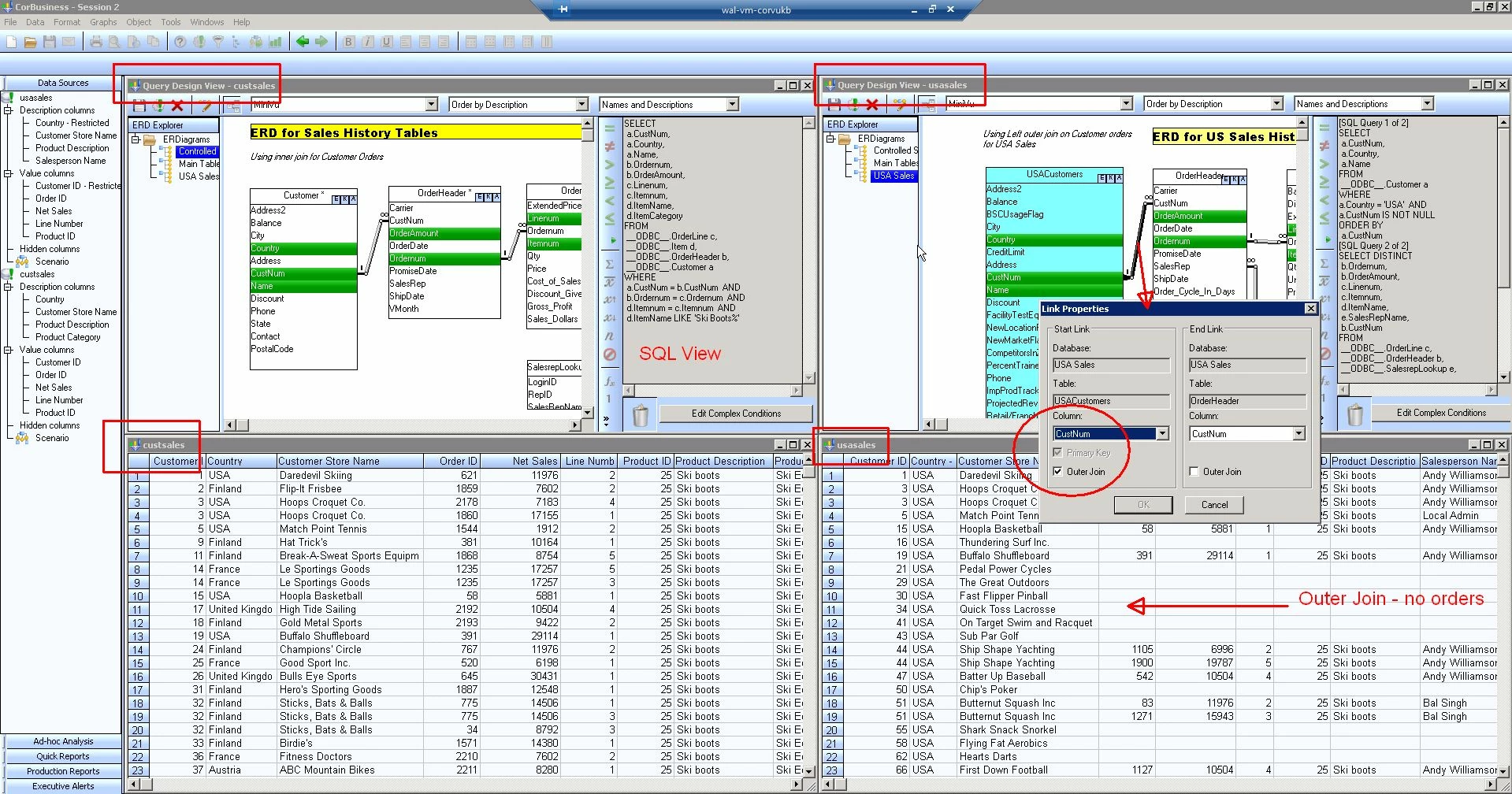 This means any selection will return all rows from the customers table even if there is no matching custnum in the OrderHeader table. This is shown in the top right panel, and the results are in the Dynamart below it showing all customer records with possible order info. You can also see the SQL view of the usasales query showing how it prepares 2 sub queries to collect all USA customer records first, then all order records second. The resulting temp tables are then joined to product the result. By the way - this ERD also has a link to the SalesRepLookup table so I can include the Salesperson name in my query design & results.