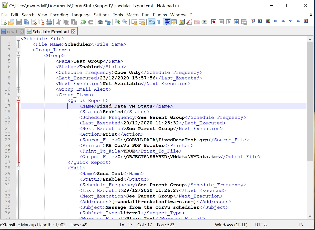 And here is the same info exported to an XML file by using the File>Export function in the Scheduler. Here I am using the excellent Notepad++ text editor to view itÂ