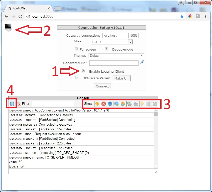 http://yourserver:3000/?hostgw=yourserver&portgw=8008&alias=tour&runtimeArgs=-d&enable_log=y