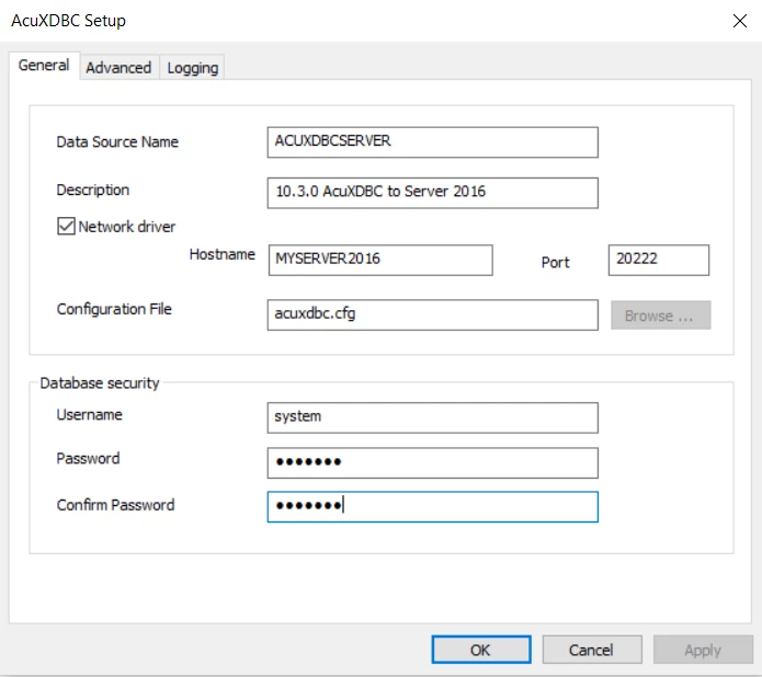Although all the information on the General tab appears to be correct and complete, on the Logging tab the Log Filename parameter is indicating a log file location that is either invalid or an area where the process does not have permission to create or write to the log file. Correcting the Log Filename parameter to a valid location will allow the ODBC connection to complete without the INVHOSTSYN error.