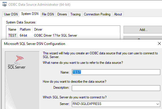 In SQL Management Studio, I created a local server TEST under RND\\SQLEXPRESS (pic1) and tested connection successfully. When I tried to connect in create.sqb, it returned "data source name not found".