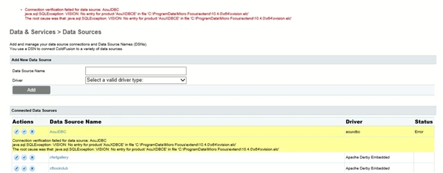 Also, you will need to ensure that the JDBC client, "vortex.jar", is located in the, ColdFusion, "cfusion\\runtime\\lib" directory, and, that the, AcuXDBC, "bin" directory is included in the system "PATH" environment variable.