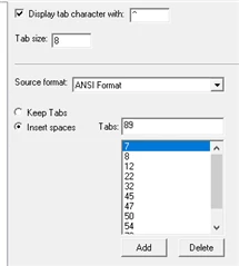 I use Insert spaces and not Keep Tabs. Source format ANSI Format. Tab size is 4 or 8 but makes no difference.