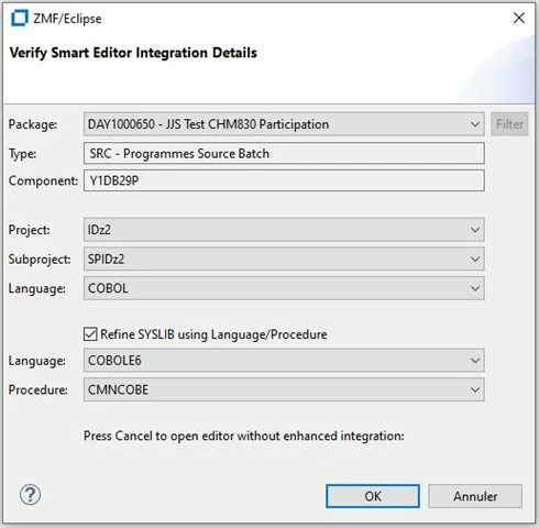 In ZMF4ECL 83, when we edit COBOL program, we use Smart Editor Integration. But every time we open a Changeman member the following dialog box opens :