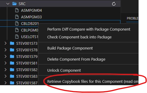 There is a separate option to right click a component in the tree structure to retrieve a component's copybooks,