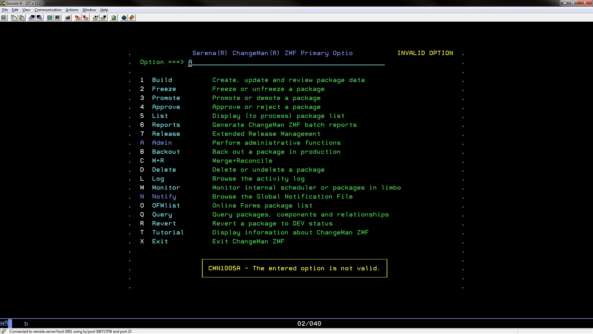 Our sample situation is that user CMNSUP1 on our ZMF 8.1 subsystem id 4 cannot access the admin option. When they logon to the ZMF ISPF client they see the unavailable ‘A Admin’ option but when they attempt to access it they receive the standard error messages: