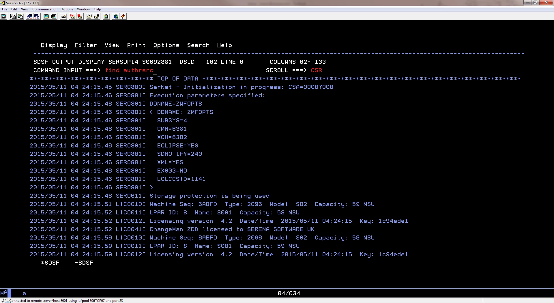 At this point simply ask user CMNSUP1 to reconnect to the ZMF ISPF client using your standard connection CLIST or rexx. The information that we require will have been generated in the started task’s SERPRINT output file as soon as connection is complete and CMNSUP1 can see the ZMF Primary Options Menu.