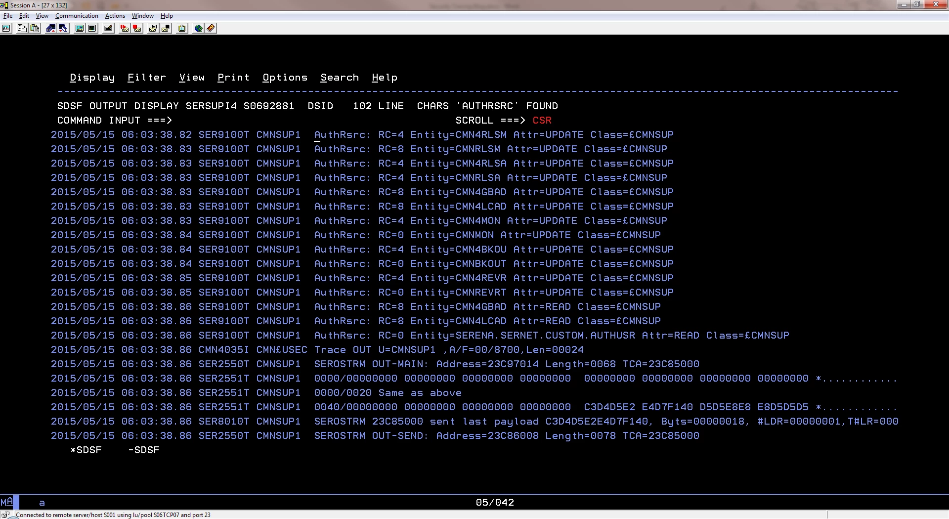 Now that the trace data has been generated we can take a look at what it is telling us. Let’s start by going to the started task's SERPRINT output file and issuing a “find authrsrc” command: