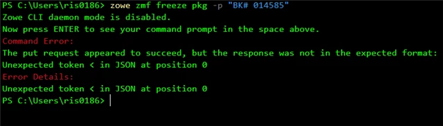 [2024/07/09 08:34:34.275] [TRACE] [DaemonClient.js:201] daemon input command: zmf freeze pkg -p BK# 014585 --zmf-profile zmfREST --rfj