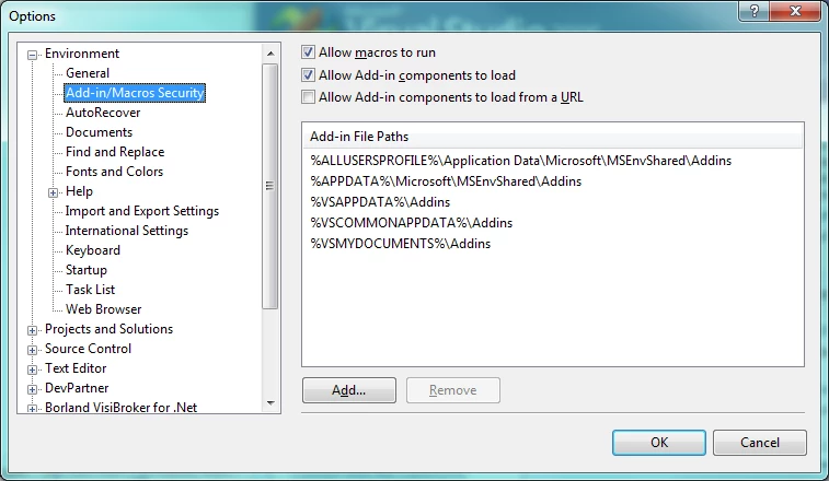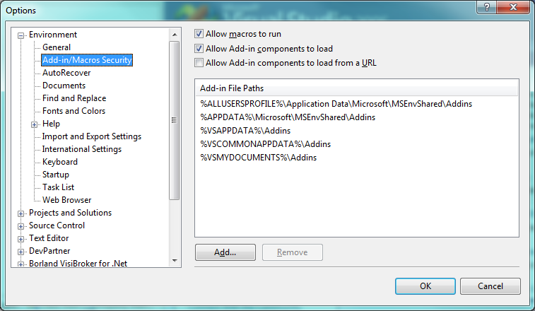 1. Go to "C:\\Documents and Settings\\All Users\\Application Data\\Microsoft\\MSEnvShared\\Addins" directory which is one of the default Add-in File Paths to be looked up by MS Visual Studio for any Add-ins, as shown in Figure 2. This directory is listed as "%ALLUSERSPROFILE%\\Application Data\\Microsoft\\MSEnvShared\\Addins" under "Tools -> Options -> Environment -> Add-in/Macros Security". You may choose other Add-in File Paths.