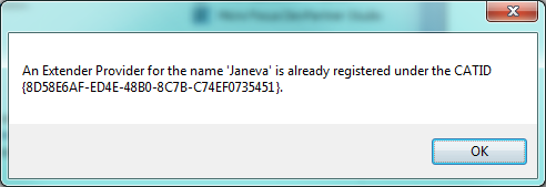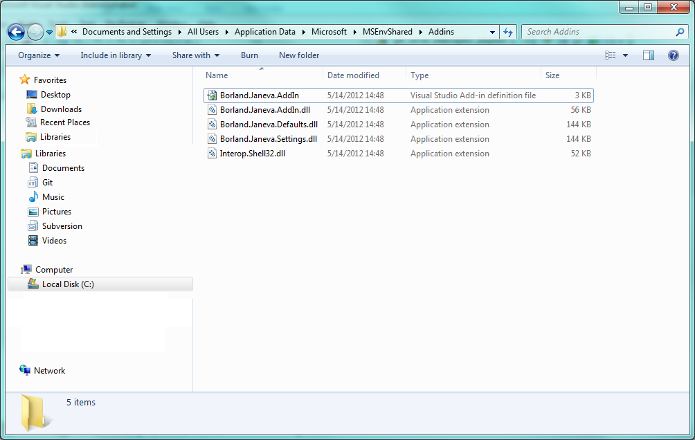 3. If not, copy the files: Borland.Janeva.Addin, Borland.Janeva.Addin.dll, Borland.Janeva.Defaults.dll, Borland.Janeva.Settings.dll, and Interop.Shell32.dll from \\VisiNet\\addin to "C:\\Documentsand Settings\\All Users\\Application Data\\Microsoft\\MSEnvShared\\Addins".