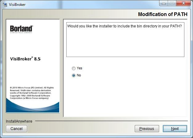 12. In next two steps, if you want to modify your PATH variable and system environment with the VisiBroker environment, then choose “Yes”.