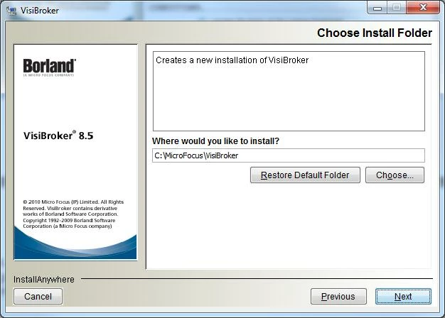 3. After accepting the license agreement, choose the installation folder. The default folder is C:\\MicroFocus\\VisiBroker.