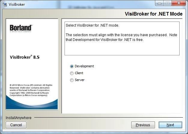 6. If you have chosen VisiBroker for .NET core as well, then you will need to choose the mode(server/client/development) in which you would be using Visi.NET.