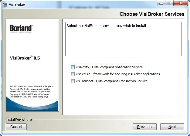 8. Next step, you need to "Choose VisiBroker Services". This step is optional. If you have purchased any VisiBroker services, then choose those ones.
