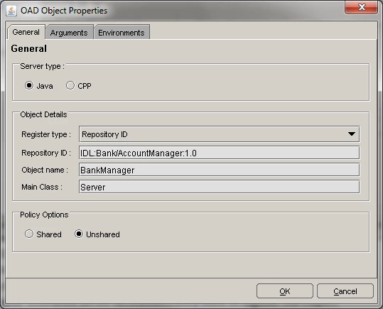 In the “General” Tab of the “OAD Object Properties” dialog box, enter the required activation policy and attributes of the object implementation: