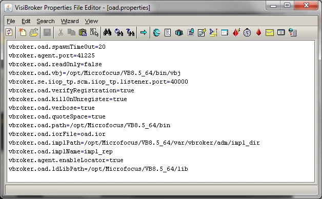 After you have configured the OAD properties using the Wizard, you can still manually modify the generated properties or add any other properties currently not handled by the Wizard using the integrated text editor. The following screen shot shows the “VisiBroker Properties File Editor” Tool editing the “oad.properties” file.