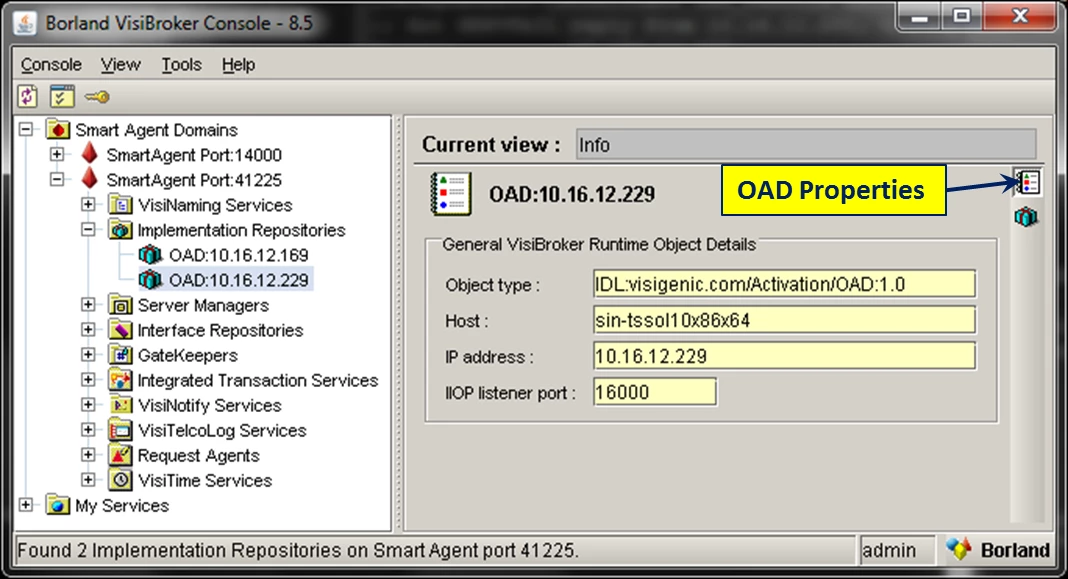 OAD can be configured with a properties file. The “VisiBroker Properties File Editor” Tool can help you edit this file. You can launch this Editor under the “Tools” pull-down menu within the VBConsole. It is a helpful tool for inexperienced users who are not familiar with the exact OAD property names, their possible values and syntax.