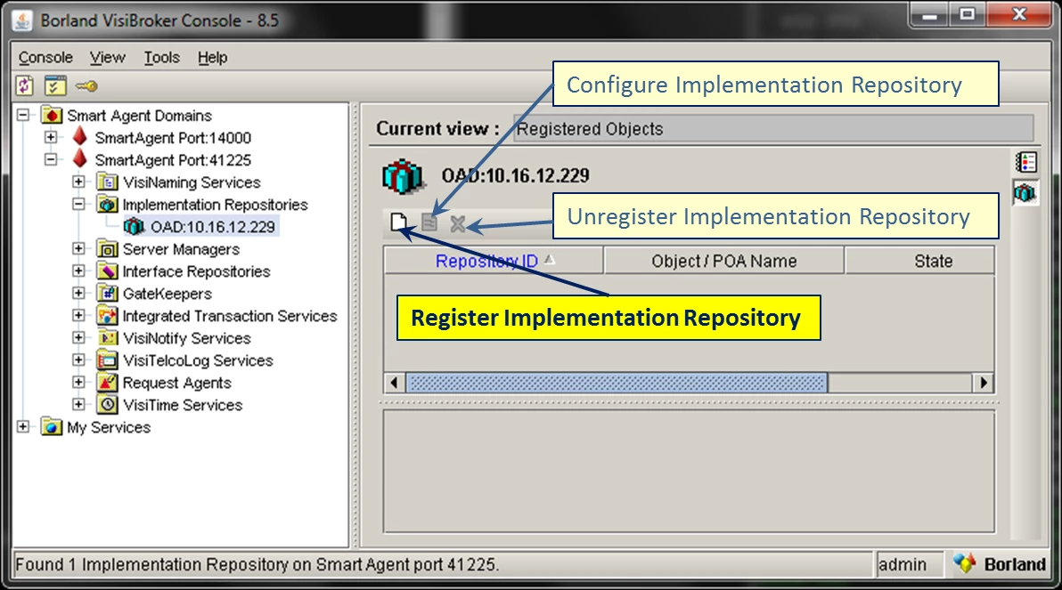 The Implementation Repository Browser inside VBConsole can be used to manage the Implementation Repository. This article assumes that you already understand the basic concept of OAD, and also have some experience managing the Implementation Repository using the “oadutil” command line tool. If necessary, you may refer to the chapter on "Using the Object Activation Daemon (OAD)" inside the VisiBroker (Java and C ) Developer's Guide in VisiBroker 8.5 documentation to learn more about VisiBroker Implementation Repository Service and OAD.