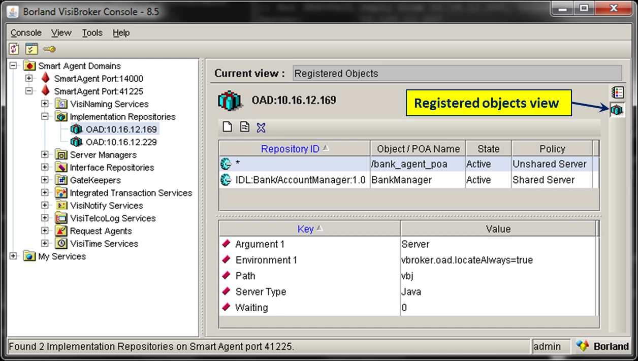 To view the registration information of all the object implementations registered with the OAD, click the “Registered objects view” button in the Content Pane. You can refresh this view by clicking the same button again.