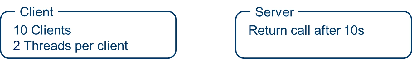 - Start 10 Clients which create 2 threads each to call 1 Server concurrently.