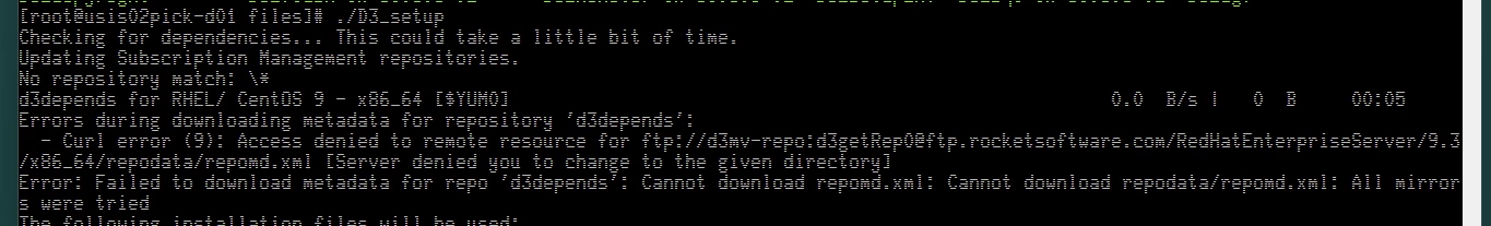 - Curl error (9): Access denied to remote resource for ftp://d3mv-repo:d3getRep0@ftp.rocketsoftware.com/RedHatEnterpriseServer/9.4/x86_64/repodata/repomd.xml [Server denied you to change to the given directory]