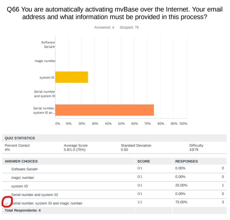 I'm posting the answers to the mvBase and D3 sections of the quiz here. Note that SurveyMonkey doesn't make it easy to share this so you have to scroll through many pages of information just to see the right answers. A lot of the stats are just plain wrong, so focus in on the table at the bottom of each page/question. The green check mark shows the right answer while the table and chart above show the distribution of responses.