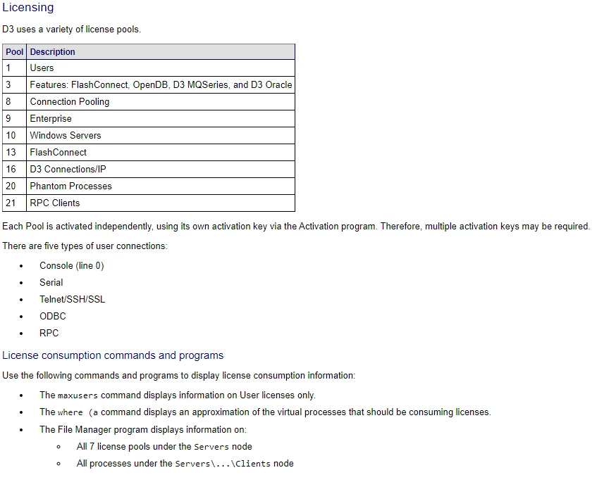 The tricky part is D3's 3-for-1 licensing model where you can get 3 connections from a single source for 1 user license ( actually it's 2 and 1 for 1, meaning you can get 2 of one connection type and 1 of another connection type but not 3 of the same connection type, connection types being telnet, ODBC, and on D3 Windows RPC ). This is where you need to see the IP address from where the PIB is connected. This is where the !d3 -qn and nt_pinfo commands come into play.