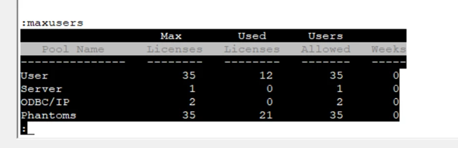 MAXUSERS shows how many user and phantom licenses are consumed ( yes, they come from different pools ). LISTU will obviously show you the users who are logged on. WHERE A will show you either a "+" next to PIBs possibly consuming a user license, a "=" next to PIBs consuming a phantom license, and if you're running FlashConnect or socket stuff, you may see PIBs with a "#" next to them indicating they are consuming a user license AND a phantom license.