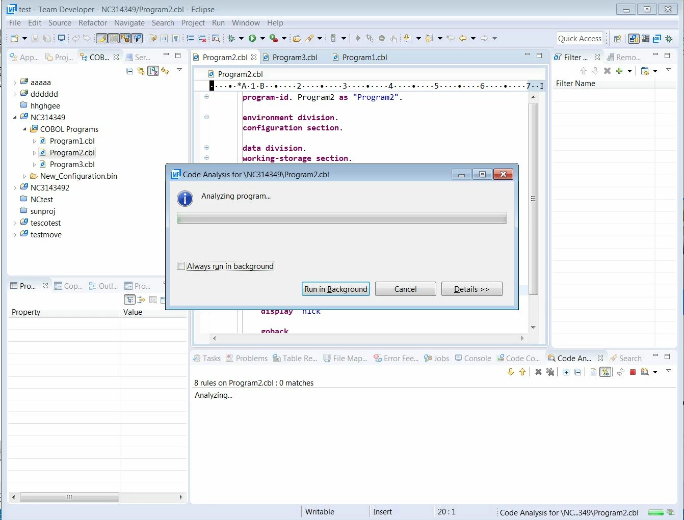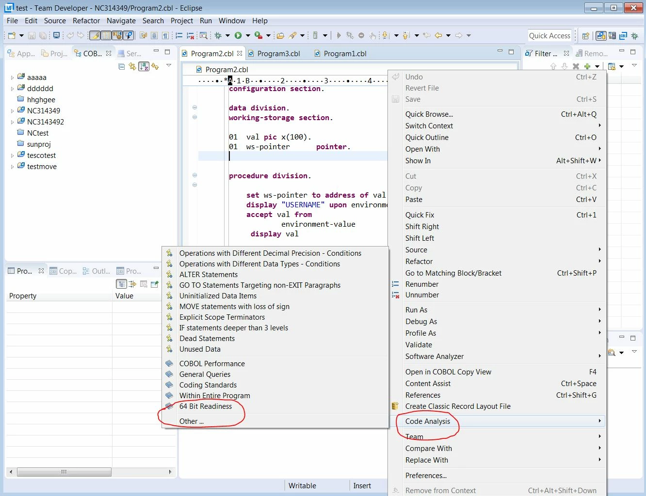 To run Code Analysis, right-click a COBOL program or a project in the COBOL perspective or alternatively, right-click in the program editor window. A menu of options will pop up, where you should select Code Analysis, Another menu will pop up where you should select '64 Bit Readiness'.