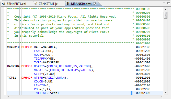 1. In the COBOL explorer, under BMS Source Files - Right-click on the BMS file MBANK10.BMS and select Open With, then BMS Editor