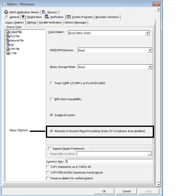 From Enterprise Analyzer (EA) 3.4 Hot Fix 8 and EA 3.5 Hot Fix 2 there is now a new workspace option for the ACU Cobol dialect called "Attempts to Resolve Mixed Formatting Styles..” (see screenshot attached). This needs to be selected as by default is it turned off.