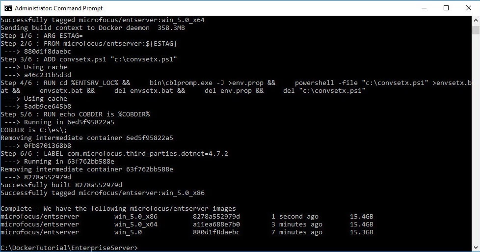Note: microfocus/entserver:win5.0_x86 and microfocus/entserver:win5.0_x64 are your Enterprise Server images that you will use as bases whenever you subsequently create images containing applications to run under Enterprise Server. These images are licensed to run Enterprise Server courtesy of your .mflic file that you copied into the \\DockerTutorial\\EnterpriseServer directory. |