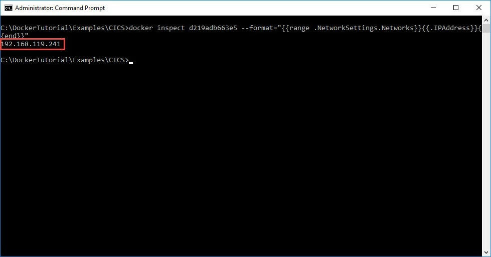 docker inspect d219adb663e5 --format="{{range .NetworkSettings.Networks}}{{.IPAddress}}{{end}}"and the result from this command is shown below: